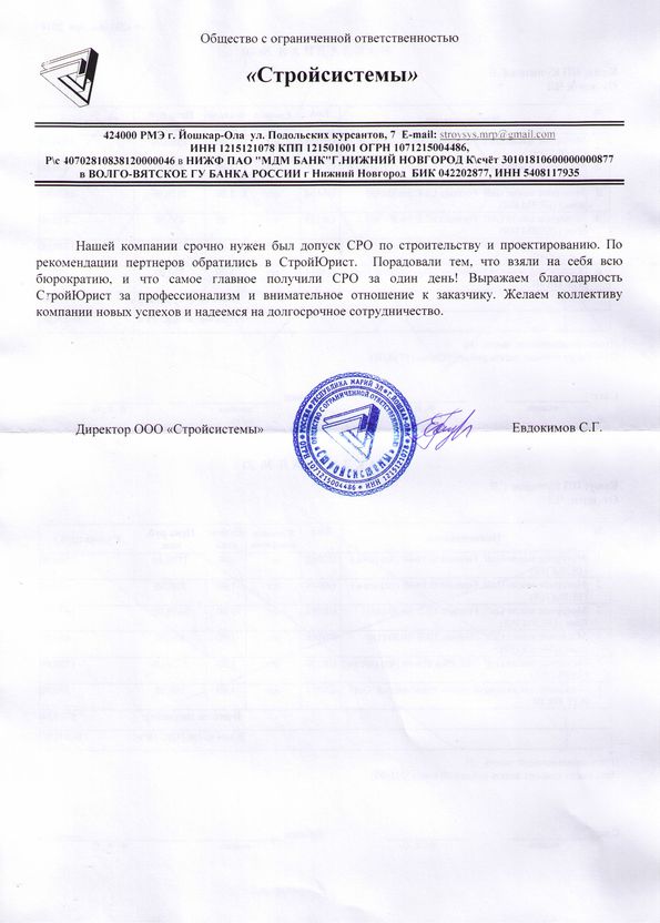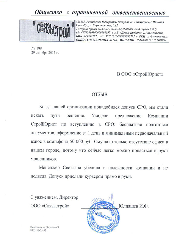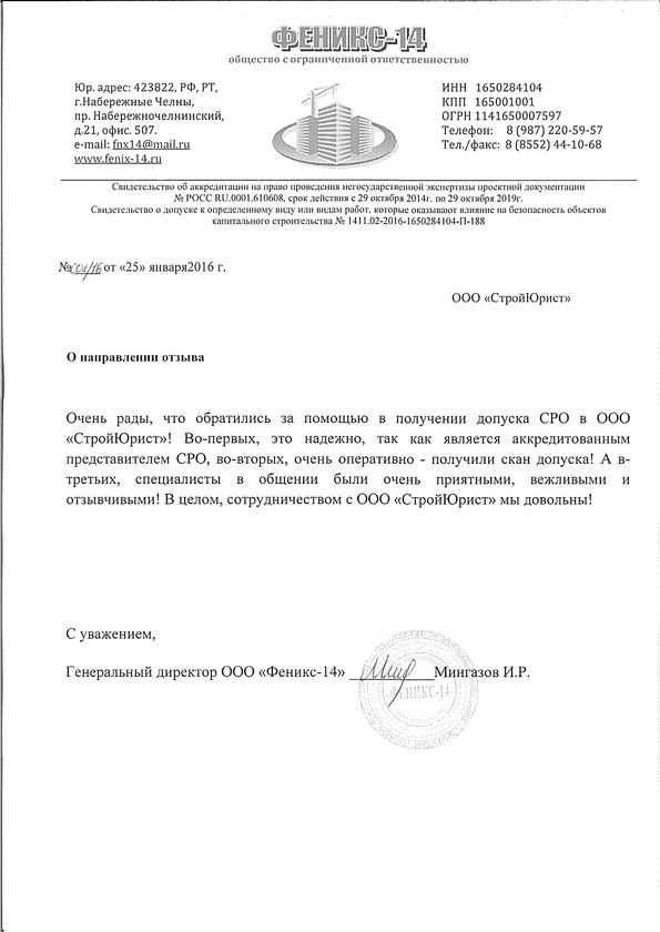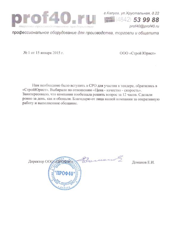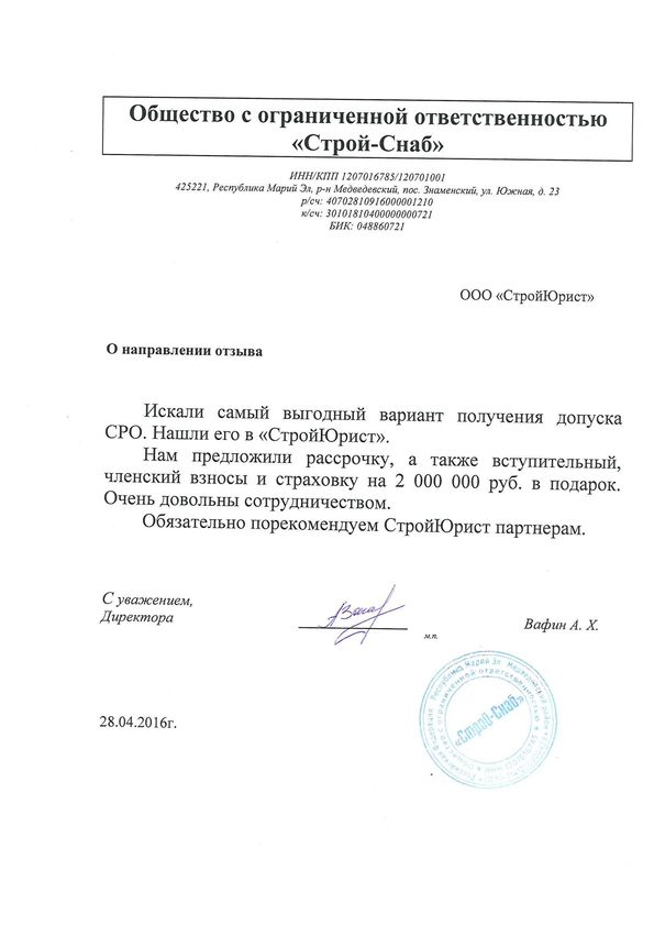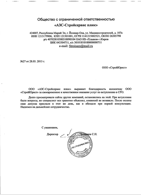Отзывы клиентов "СтройЮрист" по вступлению в СРО в Первоуральске