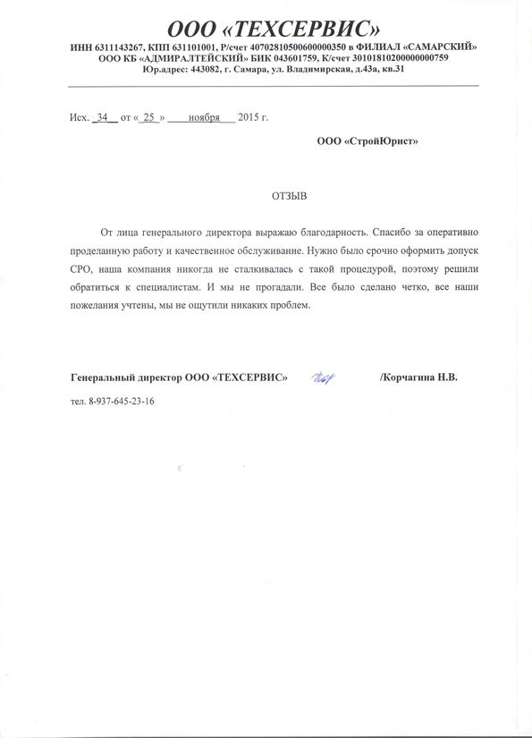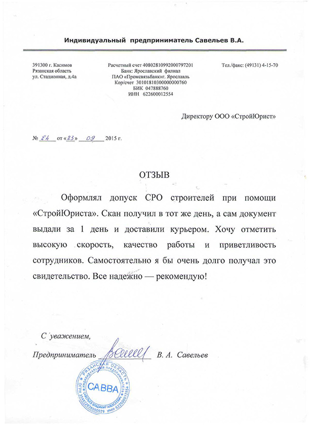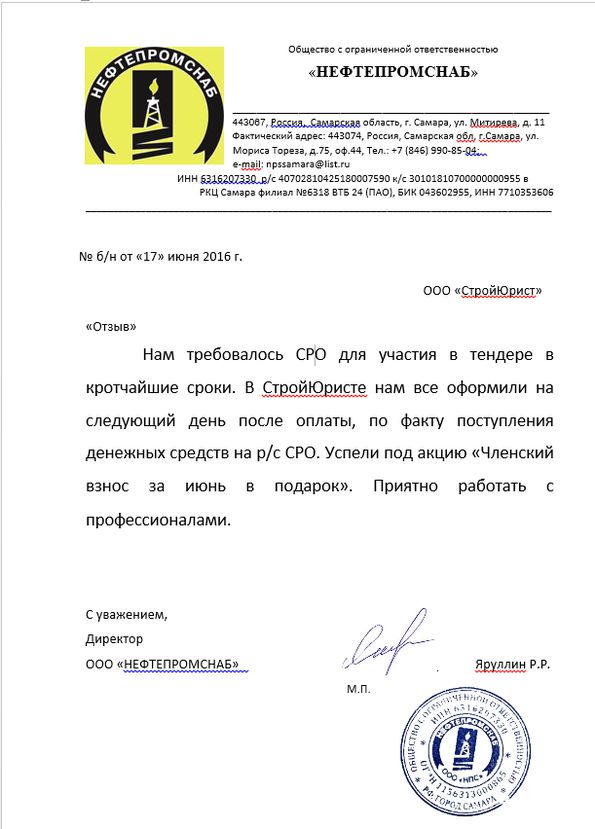 Отзывы клиентов "СтройЮрист" по вступлению в СРО в Первоуральске