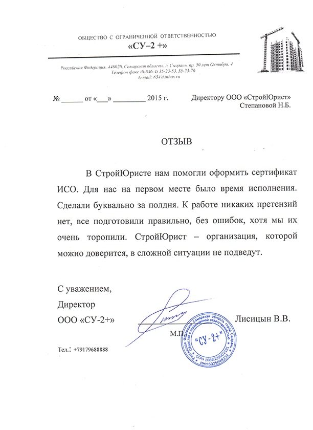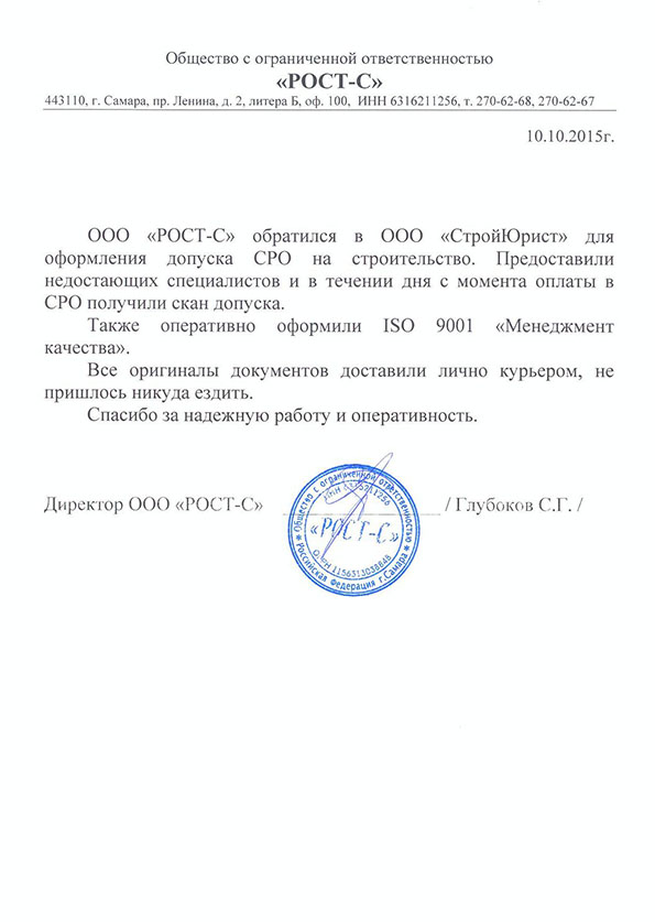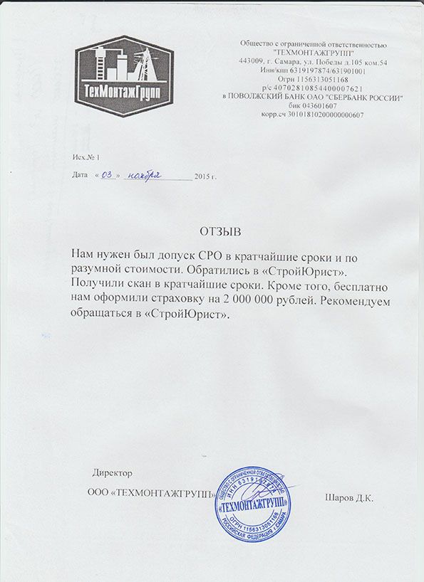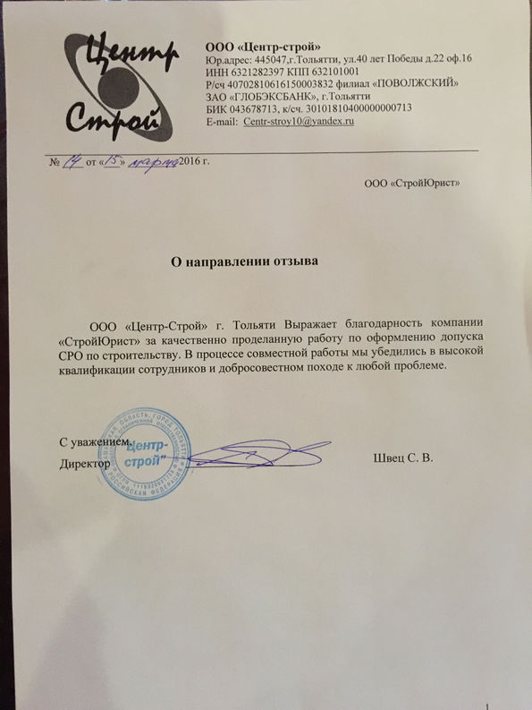 Отзывы клиентов "СтройЮрист" по вступлению в СРО в Первоуральске