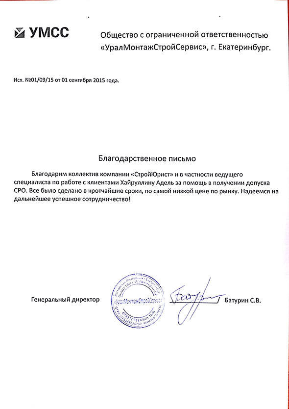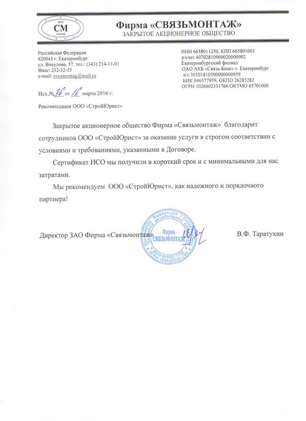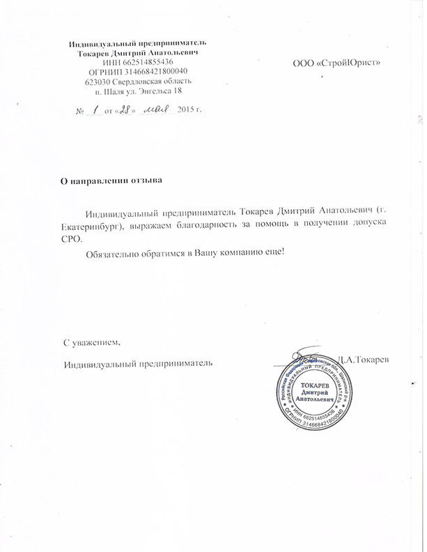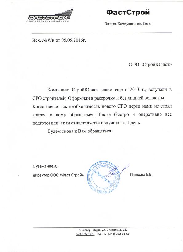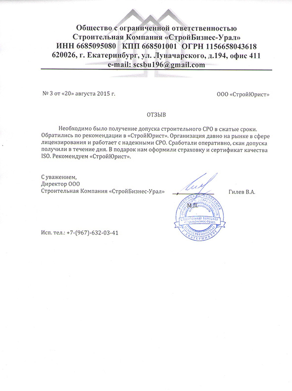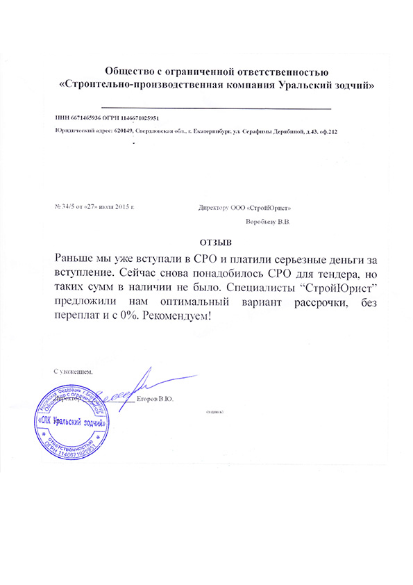 Отзывы клиентов "СтройЮрист" по вступлению в СРО в Первоуральске