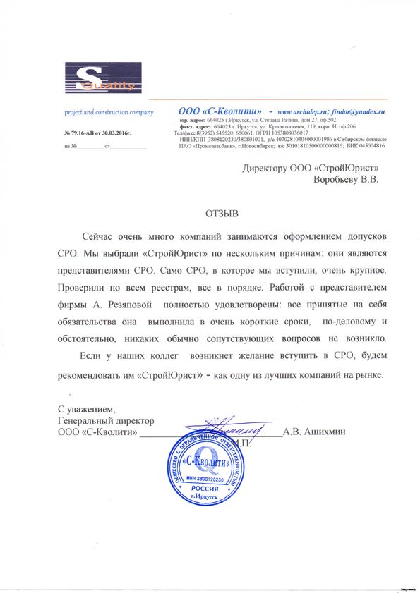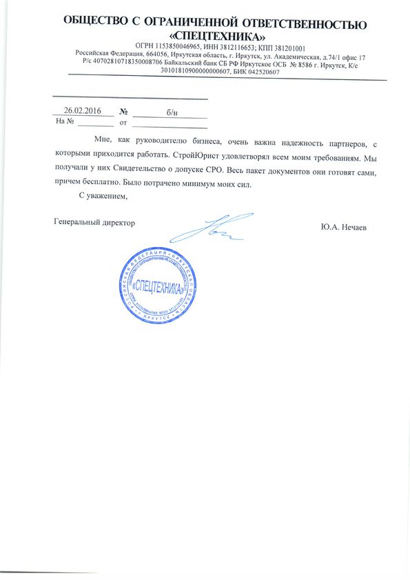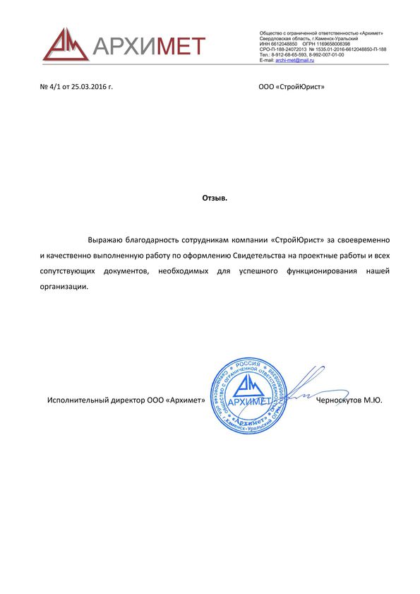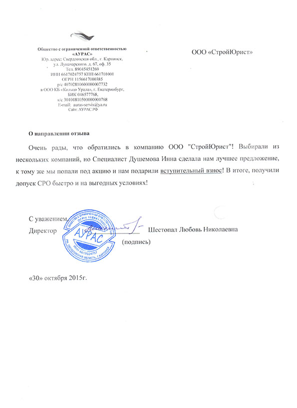 Отзывы клиентов "СтройЮрист" по вступлению в СРО в Первоуральске