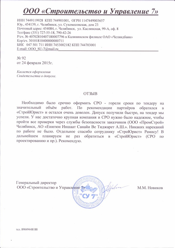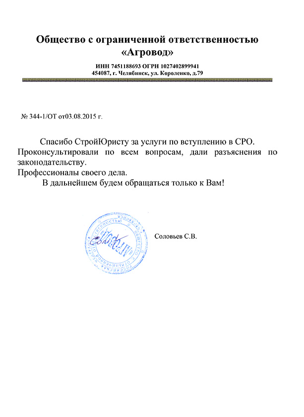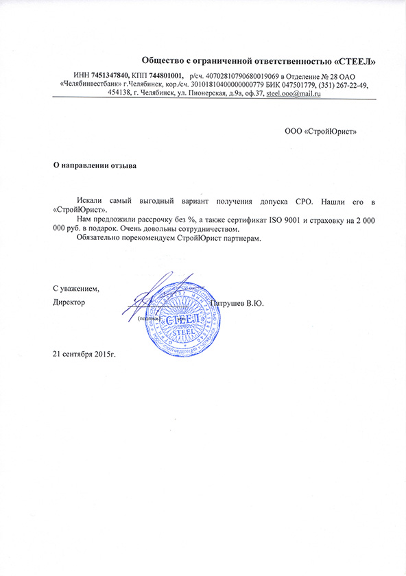 Отзывы клиентов "СтройЮрист" по вступлению в СРО в Первоуральске